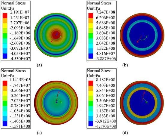 As shown in Figure 11d, the maximum tensile stress of the rotor appears in the protective sleeve, and the tangential stress decreases with the increase in radius. The ranges of change are 850~800 MPa and 800~750 MPa under no-load and load conditions, respectively. This is mainly because the protective sleeve as the outermost structure of the rotor needs to bear large centrifugal force inside, resulting in huge tangential tensile stress. In addition, the different ranges of stress variation under the two conditions indicates that the influence of temperature rise on the tangential force of the protective sleeve cannot be ignored. The difference of the radial stress between the two conditions is about 20 MPa, and it gradually decreases with the radius until 0. This is because the outer diameter is not subjected to any constraints, and there is interference fit at the inner diameter. According to the tensile strength (1390 MPa) of the selected material Inconel718 and the first strength theory, the tensile stress of the protective sleeve can meet the requirement of the strength of the material.