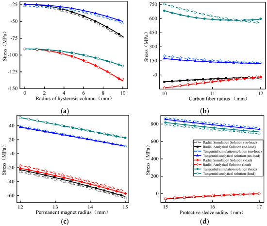 As shown in Figure 11a, with the increase in the radius of the hysteresis column, the stress difference between the conditions under no-load and load increases continually; the maximum difference is 70 Mpa, which is caused by the temperature difference of 140 °C between the two conditions. The two kinds of stresses increase with the increase in the radius of the hysteresis column due to the influence of pre-stress and thermal expansion of the material. In addition, the radial and tangential stresses at the rotor center are −25 MPa and −90 MPa, respectively, which is due to the fact that tangential driving force is greater than centrifugal force. As shown in Figure 11b, since carbon fiber is an anisotropic material, its tangential and radial stresses g vary greatly at the inner diameter, whether it is loaded or unloaded. Taking the analytical solution of load as an example, the amplitude change of radial stress is about 70 MPa, and the amplitude change of tangential stress is nearly twice that of radial stress, which is because of the fact that the tangential elastic modulus is much larger than the radial elastic modulus. Under the high speed 120 kr/min condition, the interference fit between the carbon fiber and the hysteresis column is 0.01 mm, which increases the pre-stress of the hysteresis column. Therefore, the whole hysteresis column presents a compression state, and its stress direction is opposite to that of the carbon fiber. The carbon fiber sleeve presents a state of radial compression and tangential tension as a whole, and the stresses in two directions decrease with the increase in radius which yields the minimum value at the outer diameter. Under the two working conditions, the error of the semi-analytical solution and simulation results of the tangential stress for the carbon fiber is less than 6%, among which the error is the largest under load. On one hand, the carbon fiber is regarded as a whole in modeling, which is different from the actual laminated winding. On the other hand, due to the influence of thermal expansion coefficient and elastic modulus at high speed and high temperature, the tangential stress error becomes larger. According to the above analysis, both material strength and the temperature gradient errors meet the engineering design requirements.