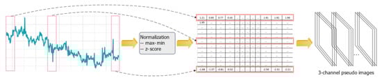 The previous time–frequency transformation from 1D time-series signals to 2D synthetic images is usually time-consuming (e.g., the wavelet transformation for a sliding window of 1032 will take 1.653 s on Google Colab) and requires expert knowledge of the frequency spectrum. In contrast, the spatial reconstruction from the same time-series sliding window to a grayscale image like in [30] will only take 0.0001 s. However, the generated single-channel grayscale image cannot be utilised directly as input for the popular deep CNNs because they are designed for three-channel RGB images. Hence, an improved three-channel pseudo-image reconstruction (i.e., imaging) method is proposed here, as shown in Figure 4.