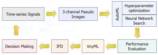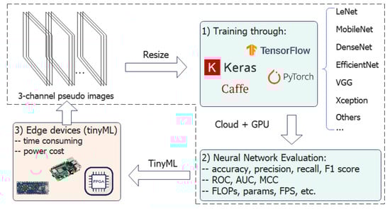 After the proposed imaging, the derived three-channel pseudo-images are adopted as the input for integrated DL neural networks, which can be the built-in classical CNN architectures or the self-defined models. It is worth noting that the integrated neural networks are not limited to CNNs and can be any DNN architecture designed for RGB images, such as the Swim Transformer. The pseudo-images need to be resized appropriately according to the input requirement of each neural network. Then, the AutoML procedure can be carried out as shown in Figure 5, consisting of (1) automatic training through the popular DL frameworks for the integrated CNN architectures; (2) neural network search (and hyperparameter optimisation) based on evaluation according to various metrics; and (3) deployment on an edge device through tinyML.