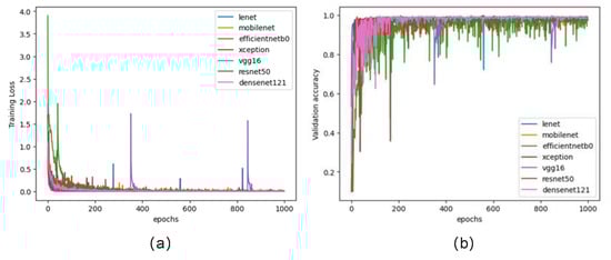 Firstly, the uniaxial acceleration signals for each bearing health condition were separated into segments with the size of 1024 because the 32 × 32 pseudo-images can be utilised for most built-in APIs of classical CNN architectures directly in tf.keras. The segments were split randomly into the training, validation, and test sets according to 60%:20%:20%, i.e., 2820, 940, and 940 segments, respectively. Z-score standardisation was employed on the training set, and the fitted scaler transforms the test set. The segments were reshaped to single-channel matrices and duplicated into triple-channel pseudo-images through the pipeline in Figure 4. Subsequently, the pseudo-images were provided to the integrated CNN architectures as input for training and evaluation. Here, the pseudo-images were resized to 75 × 75 through nearest-neighbour interpolation when necessary to meet the input shape requirements of some CNN architectures, such as Xception. A fixed training configuration was employed in the experiment to test the framework availability for neural network selection, as shown in Table 3. Automatic hyperparameter optimisation can be further integrated in future work. The training loss and test accuracy are shown in Figure 8.