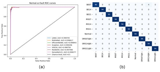 (a) AUC for each model on the CWRU dataset and (b) confusion matrix of Xception on the CWRU dataset.