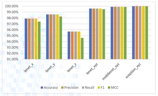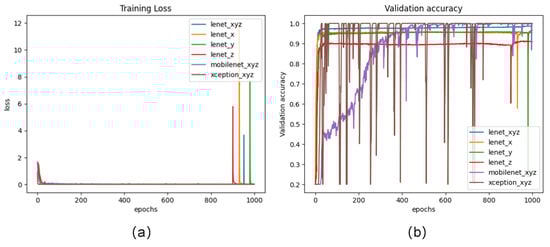 Initially, the planetary vibration signals for each axis were separated into segments with a size of 1024. Then, the segments were split randomly into the training, validation, and test sets under 60%:20%:20%, i.e., 3100, 1000, and 1000 segments, respectively. Z-score standardisation was employed on the training set, and the fitted scaler transformed the test set. Moreover, the segments were reconstructed into three-channel pseudo-images by stacking the single-channel image from each axis to achieve triaxial data fusion. Subsequently, the pseudo-images wer provided to the integrated CNN architectures as input for training and evaluation. Here, the pseudo-images were resized to 75 × 75 through nearest-neighbour interpolation to meet the input shape requirements of some CNN architectures, such as Xception, when necessary. Like case 1, a fixed training configuration was employed in the experiment, as shown in Table 3. The training loss and test accuracy are shown in Figure 11, where lenet_x, lenet_y, and lenet_z denote the LeNet-5 performance based on the data on a single axis. In contrast, lenet_xyz, mobile_xyz, and xception_xyz represent the model performance based on the triaxial data through the proposed image-like data fusion.