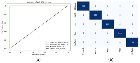 The test performance of each model, including accuracy, precision, recall, F1 score, and normal-vs-fault AUC, is shown in Figure 12, where x, y, z, and xyz denote the models with single- or triaxial signals. As can be seen, the model with the triaxial signals through the proposed image-like data fusion can achieve better performance than the model with the uniaxial signals, i.e., lenet_xyz performs better than lenet_x, lenet_y, and lenet_z. The Xception model with resized pseudo-images (75 × 75 × 3) as input has the best performance, and its confusion matrix is shown in Figure 13. The FLOPs, parameters, and average FPS (within 100 times) are shown in Table 5. After conversion through the TFLiteConverter [36], the derived lightweight Xception model can be deployed on Raspberry Pi for practical applications. This demonstrates that data fusion and model training for IFD with the triaxial signals can be achieved through the proposed framework by leveraging AutoML-CNN and the proposed image-like data fusion.