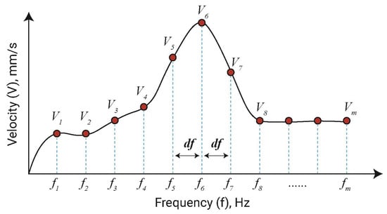 The velocity spectrum is generally useful for rotor-related fault detection. Hence, the velocity spectra are estimated from the measured vibration acceleration data. The relationship between velocity and acceleration at a given frequency is defined in Equation (6), which is used to compute the velocity spectrum: