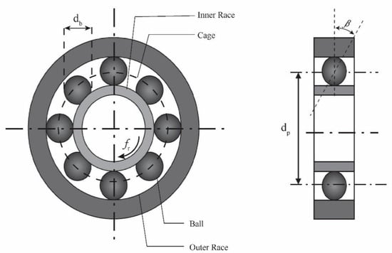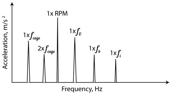 Envelope analysis, also known as amplitude demodulation, is an effective technique for detecting bearing faults in rotating machinery. This method involves extracting the high-frequency components related to the fault by filtering the raw vibration signal. To detect bearing-related faults, the signal is filtered using band-pass filtering from 2000 Hz to 5000 Hz. Then, the envelope of the filtered signal is computed using the Hilbert transform []. The envelope signal is then calculated as the magnitude of the complex signal formed by the original filtered signal and its Hilbert transform []. The envelope signal is transformed into the frequency domain using FFT as per Equation (3). The resulting spectrum is analysed for characteristic fault frequencies associated with bearing defects related to the bearing geometry and the rotational speed of the machine []. These are often referred to as bearing characteristic frequencies and can include the frequency related to a ball defect (), the frequency related to a defect in the inner race (), the frequency related to a defect in the outer race (), and the frequency related to a defect in the cage (). In the case of a defect, the acceleration amplitude of these frequencies or their harmonics and sidebands will have peaks in the envelope spectrum, allowing the type of bearing fault to be identified. Figure 3 shows a schematic diagram of a ball bearing and its components. Figure 4 illustrates the characteristic frequencies of bearing components in the envelope analysis.