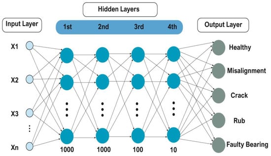 The earlier study by Sepulveda and Sinha [] used the ANN-based VML model for rotor fault identification. The VML model framework is kept exactly the same for further extension to bearing fault detection to standardise the model for any industrial application. This model is summarised here to aid understanding. The ANNs are knowledge-based systems developed through a training process that builds a connection between symptoms and the underlying causes of those symptoms []. The study implements a multi-layered perceptron (MLP) network structure formed by four hidden layers of weight between the inputs and the outputs []. The MLP is mainly employed for pattern recognition and extracting feature classifications as inputs. The network parameters, such as the number of layers, neurons, and types of functions utilised at the various stages, are established and modified through iterations. The output of these iterations is a feed-forward network with four hidden layers. Figure 5 shows the four layers with a variable quantity of non-linear neurons, namely, 1000, 1000, 100, and 10, respectively. The ANN model used in this work is nearly the same as the one used by Espinoza-Sepulveda and Sinha [], with a slight modification in the output layer to include the effect of bearing faults.