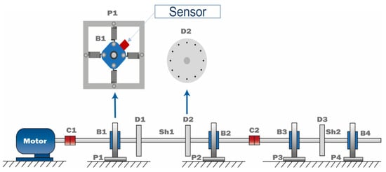The laboratory-scaled rig is depicted in Figure 6. The data being analysed in the current study have been measured previously by Luwei []. A schematic diagram of the experimental rig is illustrated in Figure 7. The laboratory rig includes two steel shafts with two different lengths and an identical diameter of 20 mm. The first shaft (SH1) has a length of 1 m, and the second shaft (SH2) has a length of 0.5 m. A rigid coupling connects both shafts. Two grease-lubricated ball bearings support each of the two shafts. Each bearing is secured flexibly with four springs to the rectangular bearing pedestal. The bearing pedestals are secured to a steel base bolted to the base structure. A flexible coupling connects the rotor-bearing-foundation system with a three-phase motor to drive the rotor at different speeds. The motor has a power of 0.75 kW, and the maximum speed is 3000 RPM. Two balancing discs are attached to shaft SH1, and a single balancing disc is attached to shaft SH2. The balancing discs have a diameter of 125 mm and a thickness of 14 mm. Single accelerometers with a sensitivity of 100 mV/g are installed on each of the four bearing housings.