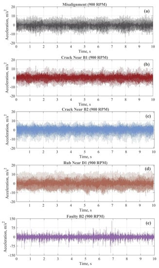 Typical time−domain waveform at bearing 2 (B2) for the different machine faulty conditions at a rotating speed of 900 RPM. (a) Misalignment, (b) crack near B1, (c) crack near B2, (d) rub near D1, (e) faulty B2.
