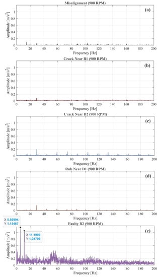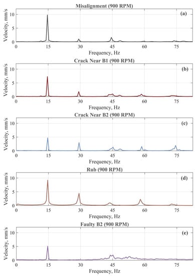 Typical velocity vibration spectra at bearing 2 (B2) for the different machine faulty conditions at a rotating speed of 900 RPM. (a) Misalignment, (b) crack near B1, (c) crack near B2, (d) rub near D1, (e) faulty B2.