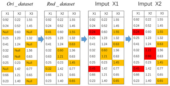 Data missing design and data imputation: To simulate the working conditions of the “Haizhe” AUV with data missing in the deep-sea environment, the missing rate of the raw dataset is set according to the following steps. Denote as the randomly missing feature variables in the raw dataset. The number of randomly missing values is denoted as , where r is the missing rate, n is the sequence length, and k is the number of missing variables. In the presence of working conditions with missing data, the RF-MICE technique introduced in the previous section is applied on the previous step of missing data design.