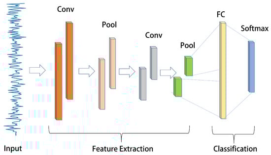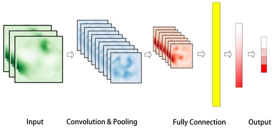The typical structure of a CNN, as shown in Figure 2, consists of an input layer that is generally a grayscale image or a color image with three channels. Convolution and pooling layers, the fundamental components of a CNN structure, are responsible for constructing multiple filters that can extract features from the data. These layers convolve and pool the input data layer by layer, extracting the topological feature map concealed within the data. Sub-sampling can effectively utilize the local features inherent in the data’s characteristics, reducing data dimensionality, optimizing the network structure, and preventing overfitting. After passing through multiple convolutions and pooling layers, the pooled data are then expanded to a fully connected layer. This layer is connected to a hidden layer and ultimately mapped to the output layer using the softmax function.
