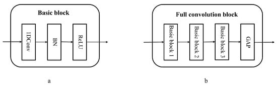 The fault feature extraction module consists of eight identical full convolution blocks running in parallel. Each full convolution block is composed of three basic blocks, namely 1D-Conv + BN (Batch Normalization) activated by ReLU, and global average pooling (GAP) [29]. Figure 5 shows the specific structures of the full convolution block and basic block, which can be represented as follows: