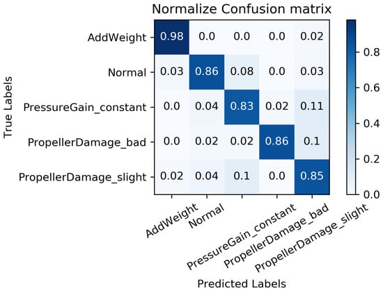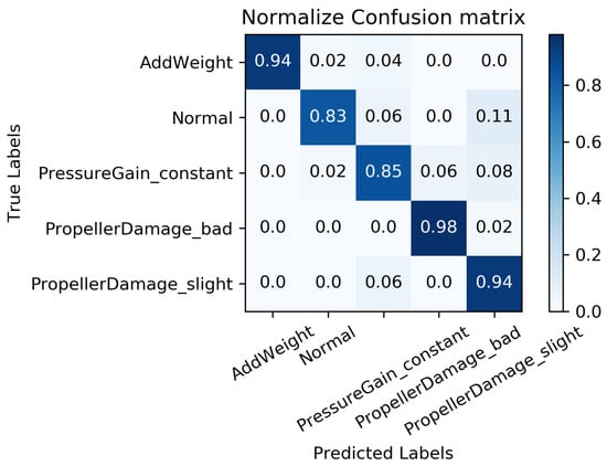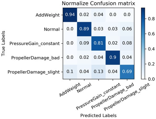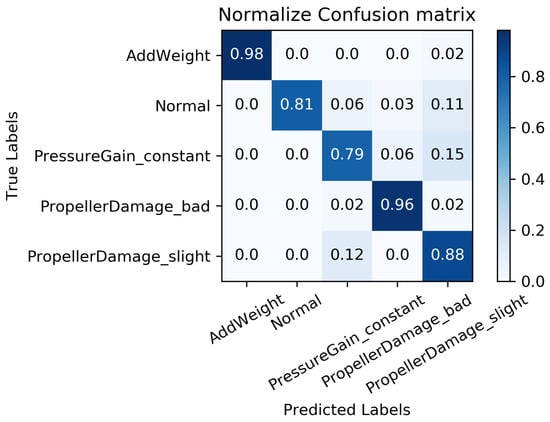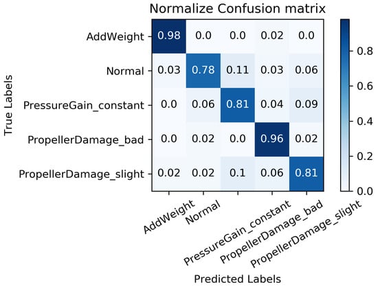 All the data from the “Haizhe” AUV working conditions, as shown in Table 2, are selected as the experimental samples. For each working condition, of the data is used for training, while the remaining is reserved for testing. The training algorithm employed is Adam with an initial learning rate of 0.001, and the objective function designed is to minimize the “cross-entropy”. In order to minimize the impact of randomness on the evaluation of data-driven fault diagnosis, 10 groups of training are implemented on the MC-FCNN model, with one group selected at random. The diagnosis results, as illustrated in Figure 8, demonstrate that the model proposed in this paper can effectively identify various “Haizhe” AUV working conditions.