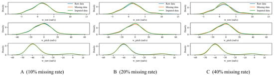 Denote the missing rate , where N is the total number of missing values, n is the variable length, and k is the number of missing variables. We aim to analyze the imputation performance of the proposed RF-MICE method when the missing rate in each sample data is , and , where . Our data imputation module is designed to be dynamic, rather than a fixed model trained solely on historical data. When encountering an online sample for diagnosis with missing data, the imputation function is triggered. In this case, our imputation model is trained by using the available data from the online sample, and the missing values are predicted and imputed. As a result, a complete data sample is generated and serves as the input for the fault diagnosis model. The imputation algorithm proposed in this paper retrains every missing sample to restore its real distribution to the greatest extent possible. The RF-MICE algorithm requires setting the iteration parameter “iter” and the parallel parameter “m”. In our experiment, we set iter = 3 and m = 4. Figure 13 displays the actual probability density distribution curve for each missing variable and the probability density distribution curve after imputation.