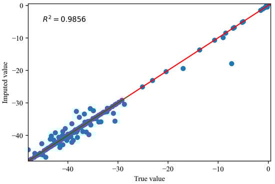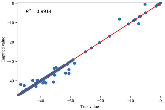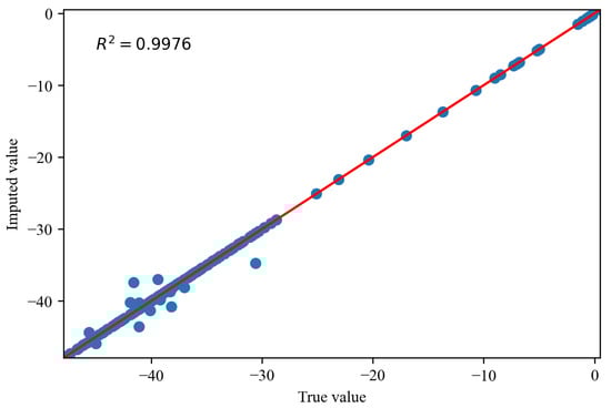 Figure 14, Figure 15 and Figure 16 depict the comparisons between the actual values and imputed values of the randomly selected missing variable , with the representation of R squared () indicating the accuracy of data imputation. By comparing Figure 13, we can find that, as the missing degree increases, the deviation in distribution between the imputed values of the variable and the original data gradually increases. On the other hand, there is no noticeable difference in the distribution deviation between the imputed values of the variables and with the original data. It is noteworthy that, regardless of the degree of missing values, our proposed imputation method yields imputed distributions that closely resemble the original distribution. This suggests that our imputation method does not alter the distribution of the original data. By comparing Figure 14, Figure 15 and Figure 16, we can find gradual decreases in the values of as the degree of missing data increases. However, the decreases are not statistically significant. In addition, the values of are consistently close to 1, signifying the excellent performance of our imputation method.