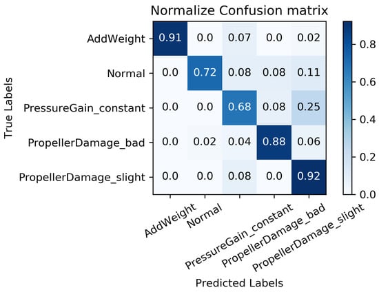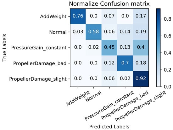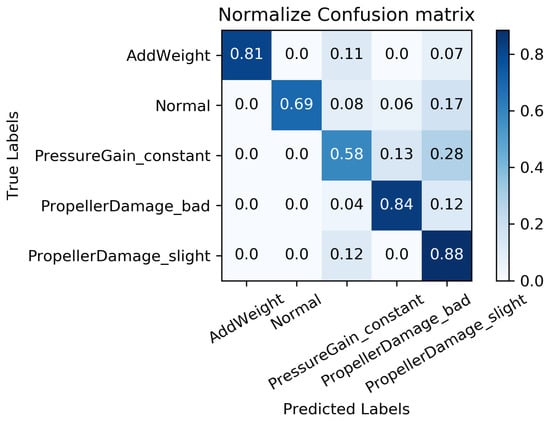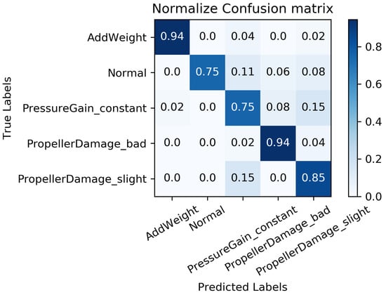 We constructed a confusion matrix, as shown in Figure 17, Figure 18, Figure 19, Figure 20 and Figure 21, to analyze the diagnosis results of the MC-FCNN model under different missing data scenarios. The confusion matrix provides an intuitive reflection of the model’s classification performance on different fault categories. It presents the correspondence between the predicted results of the classifier and the actual fault categories. The vertical axis represents the real fault categories, while the horizontal axis represents the model’s predicted results for each category. Interestingly, by comparing Figure 17, Figure 18, Figure 19, Figure 20 and Figure 21, it is evident that, with varying degrees of data loss, fault types or working conditions such as load increase, normal, depth sensor failure, and propeller severe damage are predominantly misdiagnosed as propeller slight damage. However, propeller slight damage is frequently misdiagnosed as normal working condition. This pattern suggests that propeller slight damage, being an incipient fault, may have a significant impact on the diagnosis of other fault types.