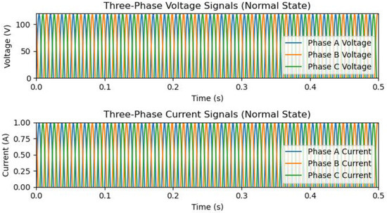 Simulated three-phase waveforms of current and voltage signals in a healthy state.