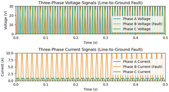 Simulated three-phase waveforms of current and voltage signals for single line-to-ground faults.