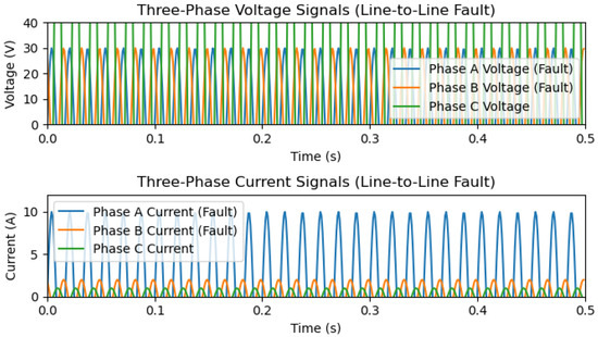 Simulated three-phase waveforms of current and voltage signals for line-to-line faults.