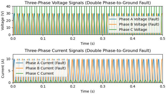 Simulated three-phase waveforms of current and voltage for double phase-to-ground faults.