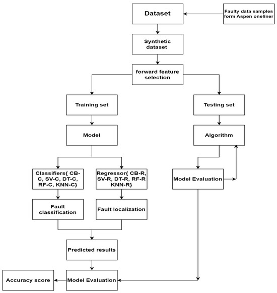 A lot of data is needed to develop good models for many machine-learning applications. Synthetic datasets are too important to generate when real-world data is scarce. Machine learning and deep learning algorithms can create synthetic data from existing datasets to guide ML architecture. The datasets train the model for fault classification and transmission line localization. The datasets with no missing values are considered as ideal. Datasets train machine learning models. Classifying faults requires these ML models. After training the ML model, testing is carried out on the ML model to check the accuracy models. Figure 9 shows the proposed methodology for the classification and regression of abnormal circumstances in transmission-carrying networks. SVMs are useful for fault classification and localization, assisted by supervision to find the hyperplane for separating data point types [23]. They may considerably improve fault classification and localization processes to find the best hyperplane in n dimensions [24,25].