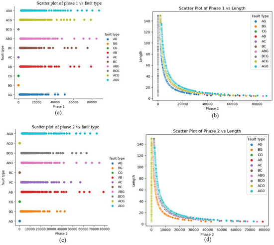 This section aims to provide a concise overview of the synthetic dataset, highlighting its connections to various types of shunt incidents occurring on transmission lines, along with their respective locations. Furthermore, we will introduce a comprehensive set of assessment metrics that effectively gauge the performance of both the classifier and regressor models. To visually portray the data distribution, we will adopt scatter plots, a technique that presents data points on a two-dimensional graph. This method serves as a robust tool for visualizing relationships and patterns embedded within the dataset. The utilization of scatter plots is intended to enhance the clarity and intuitive understanding of the dataset’s complexities, facilitating a deeper exploration of individual interactions and behaviors. Figure 11 provides the scatter plot information of every value present in the synthetically generated dataset through VAEs for classification and localization of faulty points of (a) phase 1, (b) phase 2, and (c) phase 3, respectively.