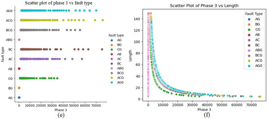 Scatter plots for classification (fault type) and localization (length) for (a,b) phase 1, (c,d) phase 2, and (e,f) phase 3 of shunt faults generated from the synthetic dataset, respectively.