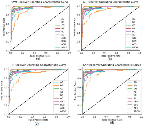 Receiver operating characteristic (ROC) curve (a) SVM, (b) DT, (c) RF, and (d) KNN for all shunt faults on transmission lines.