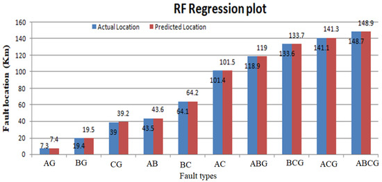 Once a specific type of fault is identified through the proposed classifier architecture, the precise prediction of shunt fault locations within transmission networks is achieved using regression models. The primary objective of these regression models is to establish a functional mapping between the input features (independent variables) and the target variable (a continuous value). Furthermore, regression serves as a means to uncover the intricate relationship between continuous input variables and their corresponding output variables. In the capacity of a regressor, a selection of diverse machine learning algorithms comes into play to pinpoint power line faults. The process involves conducting regression computations for unforeseen data instances, accounting for both the proximity and distance of the ends under observation. The regression outcomes are delineated in Figure 17, Figure 18, Figure 19 and Figure 20, illustrating a comparative analysis between the actual fault locations and those forecast by the suggested ML algorithms (SVM, DT, RF, and KNN).