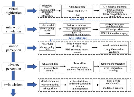 The mine hoist is already equipped with a comprehensive sensing system. Therefore, a behavioral modeling method is proposed, as shown in Figure 4, which makes full use of the existing sensing perceptual network of the mine hoist and the centralized control provided by the Programmable Logic Controller (PLC). This method aims to establish a mapping of the behavioral dimensions within the digital twin, ensuring that the twin exhibits consistent behavior with the physical model over time.