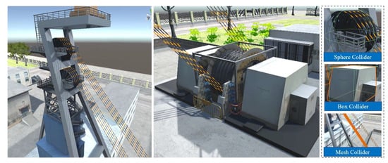 Given the large scale and numerous components of the mine hoisting system, a 3D laser point cloud-based geometric modeling method was employed. The 3D point cloud data of the mine shaft are obtained by scanning the entire mine hoist using a handheld 3D laser scanner (GeoSLAM system). During the scanning of the point cloud data, a specific path scanning optimization scheme is implemented to maximize the preservation of point cloud integrity and accelerate data acquisition speed. Various parameters are configured to apply radius and statistical joint filtering to the point cloud, aiming to identify the optimal combination of filtering parameters. Then, poisson surface reconstruction is carried out on the processed point cloud data of the mine hoisting system to generate a realistic three-dimensional surface model. According to the above point cloud processing, reconstruction, and rendering process for the main shaft and other environmental data, a highly realistic digital twin geometric model of the hoisting machine is finally obtained. The construction of the localized monitoring scene based on digital twin is shown in Figure 2.