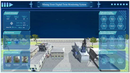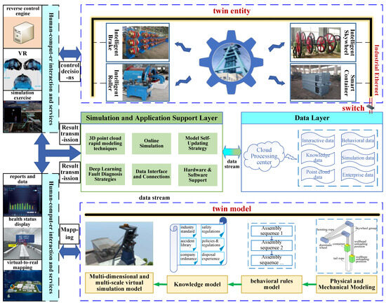 Then, based on the reference of the five-dimensional architecture of the digital twin [21], a highly realistic digital twin system for the mine hoist is constructed. This system is capable of simulating the appearance of the hoist and continuously evolving in parallel with the real hoist. This digital twin system possesses the ability to carry out independent learning and exhibit intelligence. The architecture of the system is depicted in Figure 3.