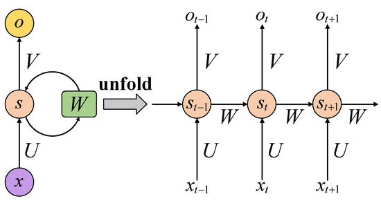 The recurrent neural network (RNN) is a widely used learning model for modeling sequential data. It falls under the category of feedback neural networks and was originally applied in the domain of natural language processing, including tasks like speech recognition and translation [22]. Based on the recursive structure of shared weights, RNN unfolds input sequential data in the direction of time or event evolution for operation, and its basic structure is shown in Figure 5.