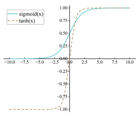 The main activation functions used in LSTM are sigmoid and tanh, represented by Equations (1) and (2) respectively: