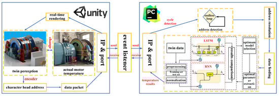 The digital twin monitoring system incorporates a data over-advance prediction module. This module initially preprocesses the state twin data, which is subsequently fed into the built-in optional neural network (LSTM or RNN) for training. It extracts relevant features and predicts the future state, thereby facilitating over-advance sensing and guiding predictive maintenance. Figure 8 illustrates the specific process of predicting hoist motor temperature based on digital twin data. Four temperature sensors are strategically positioned on the stator winding of the motor, with adjacent sensors spaced 90° apart. The mine hoist intelligent sensing network is employed to monitor the entire lifting process of the mine hoist, capturing real-time temperature data from four motor points (each dataset consists of 1933 consecutive temperature samples). Subsequently, the digital twin monitoring system of the mine hoist is trained in conjunction with a neural network. Through a comparative analysis of the model’s prediction output, sensor-measured data, and prediction variances between different networks, the digital twin model and neural network are optimized to enhance the precision of motor temperature prediction. Ultimately, the optimized prediction model effectively captures the motor temperature trend. The entire process involves a series of successive steps for the twin data. These steps include preprocessing, division of data into training and test sets, normalization, iterative training, selection of the best model, extraction of optimal parameters, anti-normalization, and the utilization of these optimal parameters for predicting the complete motor temperature cycle data, which encompasses loading, unloading, and returning to the bottom of the well. Then, the digital twin monitoring system digitally displays the operating state. Taking advantage of historical state data, the system enables online prediction and advanced perception of the next cycle’s state to determine if it exceeds the temperature threshold, thereby providing valuable guidance for predictive maintenance.