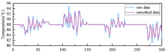 The symbols , , , and in Equations (12) and (13) represent the Kalman gain matrix, the filter optimum, the deviation matrix, and the unit matrix, respectively. By appropriately adjusting the matrices Q and R, the degree of suppression of process noise and measurement noise by the Kalman filter can be controlled and realized. The results obtained from processing a subset of acquired data using the Gauss–Kalman filter are shown in Figure 9.
