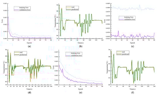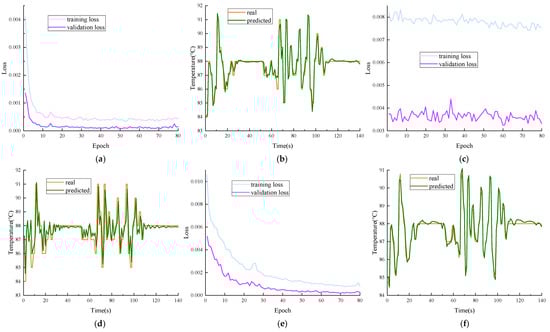 Comparison chart of training and prediction results for temperature point sensor 2: (a) loss of LSTM; (b) prediction of LSTM; (c) loss of RNN; (d) prediction of RNN; (e) loss of Gauss–Kalman–LSTM; (f) prediction of Gauss–Kalman–LSTM.