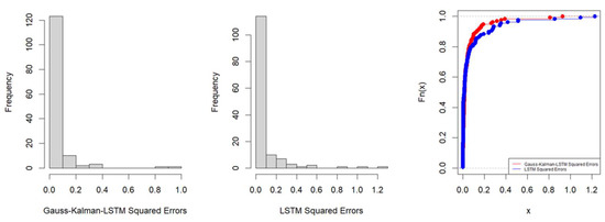 In Figure 10, only out-of-sample predictions are displayed. However, based solely on the predicted values, it is not possible to determine whether there is a statistically significant difference between the predictions of the LSTM and Gauss–Kalman–LSTM models. Therefore, we followed a statistical testing method reported in [28] for comparing the predictive accuracy of the two model groups. The results are shown in Figure 11, with a histogram of the error distribution on the left and an empirical cumulative distribution function (CDF) on the far right.