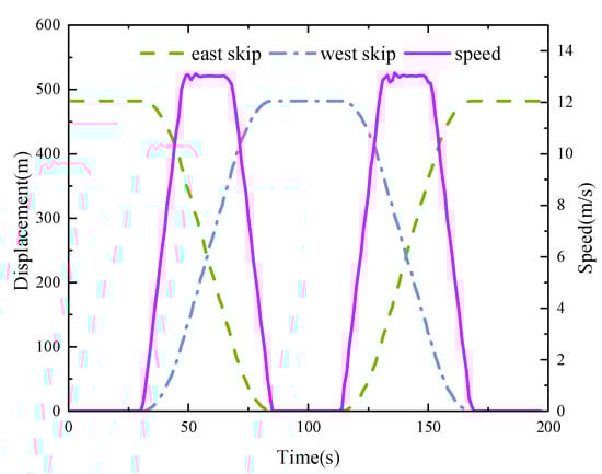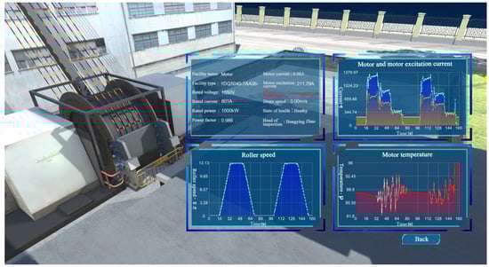 Taking the main hoisting system of a specific mine in China as an example, it has a lifting height of 483 m and a lifting capacity of 30 tons. Figure 13 illustrates the operation process of the mine hoisting system. Focusing on the east skip, we can see that it begins by stopping at a depth of approximately 470 m at the bottom of the well for loading. After loading, it accelerates to a constant speed for lifting and then decelerates to reach the unloading platform at the wellhead for unloading. Once unloaded, it returns to the bottom of the well for reloading. Throughout the entire lifting process, the speed remains consistently stable with small fluctuations. In contrast, the behavior of the west skip is precisely opposite to that of the east skip. Figure 14 illustrates the mine hoist digital twin monitoring system, which is capable of executing various functions, including scene display, human–computer interaction, motion synchronization, and condition monitoring. The current and temperature monitoring of the lifting motor is shown in Figure 15.
