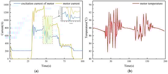 Current and temperature behavioral monitoring of hoist motor: (a) current monitoring; (b) temperature monitoring.