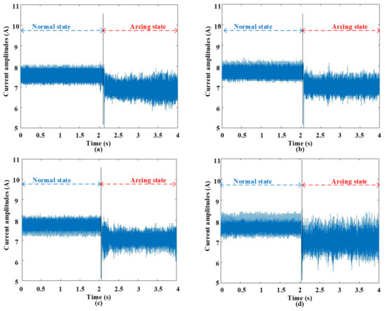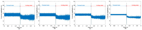 Figure 2 visually illustrates the waveforms corresponding to both normal and arcing states, recorded at different switching frequencies while maintaining a constant current amplitude of 8 A. Across the range of switching frequencies, the waveforms exhibit a consistent configuration before the onset of arcing. However, the emergence of an arc introduces a multitude of irregularities into these waveforms.