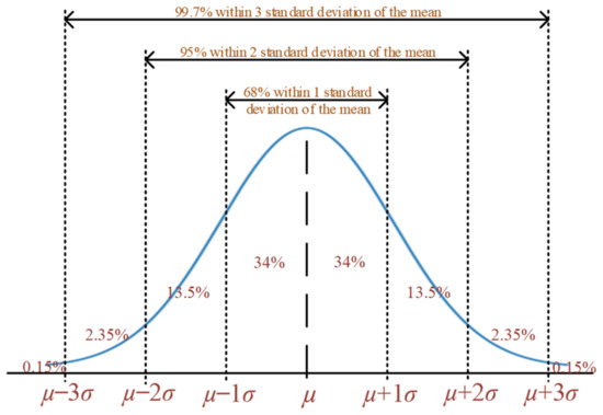 This probability distribution, stemming from the empirical rule, assumes the role of an evaluative technique. It proves especially beneficial when acquiring precise data is a time-consuming or even unfeasible endeavor in certain scenarios. Such considerations come into prominence when organizations assess their quality control protocols or endeavor to gauge their exposure to various risks. The empirical rule, sometimes referred to as the three-sigma rule or the 68-95-99.7 rule, is a fundamental statistical guideline. It posits that in the context of data conforming to a normal distribution, nearly all observed data points cluster within three standard deviations (σ or std) of the mean (µ) [20]. As shown in Figure 3, the empirical rule is illustrated. It anticipates that within such distributions, approximately 68% of data points will reside within the range of the first standard deviation (µ ± σ), about 95% within the span of the first two standard deviations (µ ± 2σ), and an overwhelmingly vast majority of roughly 99.7% within the expanse of the first three standard deviations (µ ± 3σ) centered around the mean.