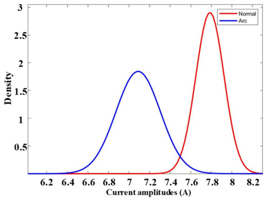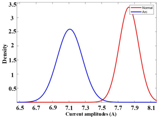 Figure 9 provides a visual representation of the probability distribution of the current for steady normal and arcing states, emphasizing scenarios characterized by an 8 A current and a switching frequency of 10 kHz. The data depicted in this figure mirror that of Figure 4, capturing both the stable normal and arcing states, but with the added element of empirical filtering utilizing one standard deviation. This comparison reveals distinctive differences between the waveforms of normal and arcing states following empirical filtering, particularly within the one-standard-deviation range. These disparities in the filtered signals hold the potential to significantly enhance the efficacy of artificial intelligence learners (AILs) in accurately distinguishing between normal and arcing states.