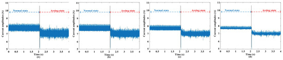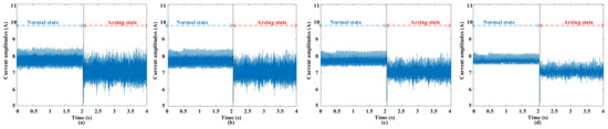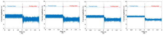 The waveforms before and after empirical filtering at 8 A and 20 kHz switching frequency. (a) Signal before filtering; (b) signal after filtering with three standard deviations; (c) signal after filtering with two standard deviations; (d) signal after filtering with one standard deviation.