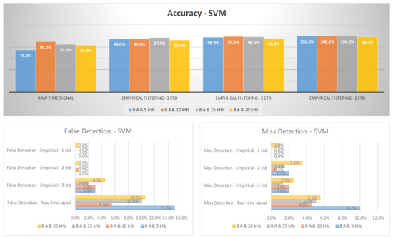 The diagnosis rates of a three-phase inverter at 5 A using empirical filtering and a support vector machine (SVM).