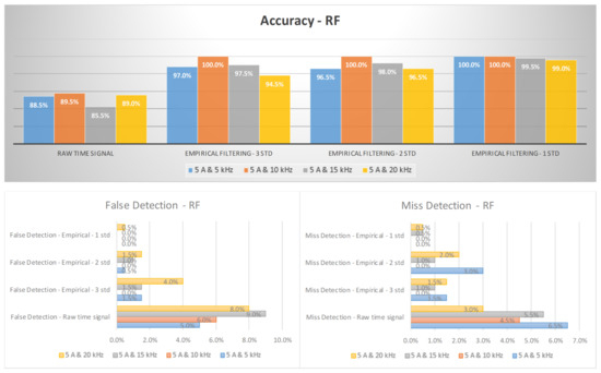 The diagnosis rates of a three-phase inverter at 5 A using empirical filtering and a random forest (RF).