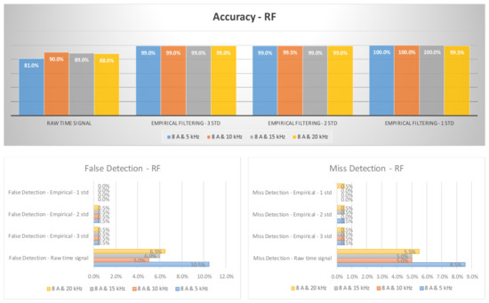The diagnosis rates of a three-phase inverter at 8 A using empirical filtering and a random forest (RF).