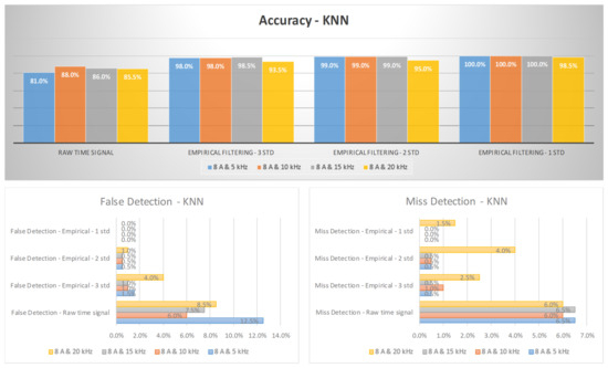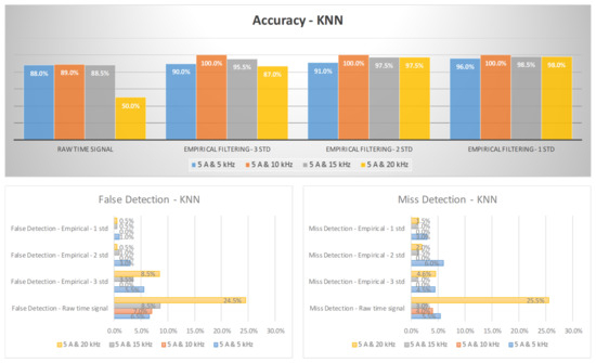 Figure 13 and Figure 14 illustrate the arc failure diagnosis rates for a three-phase inverter operating at 5 A and 8 A, respectively, across various switching frequencies. These rates are determined using empirical filtering in conjunction with an RF. The utilization of empirical filtering signals within the three σ ranges as inputs yields a discernible enhancement in the accuracy of arc fault detection when compared to relying solely on raw signals. Furthermore, as the empirical filtering ranges are further refined to two and one σ ranges, there are additional improvements in the diagnosis rates for arc failure. Figure 15 and Figure 16 illustrate the arc failure diagnosis rates for a three-phase inverter operating at 5 A and 8 A, respectively, across various switching frequencies. These rates are determined using empirical filtering in conjunction with the KNN algorithm. When the empirical filtering signals within the three σ ranges are utilized as inputs, a notable improvement in the accuracy of arc fault detection is observed compared to using the raw signals alone. Furthermore, as the empirical filtering ranges are further refined to two and one σ ranges, there are additional enhancements in the diagnosis rates for arc failure.