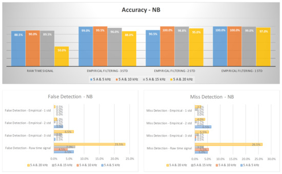 The diagnosis rates of three-phase inverter at 5 A using empirical filtering and Naïve Bayes (NB).